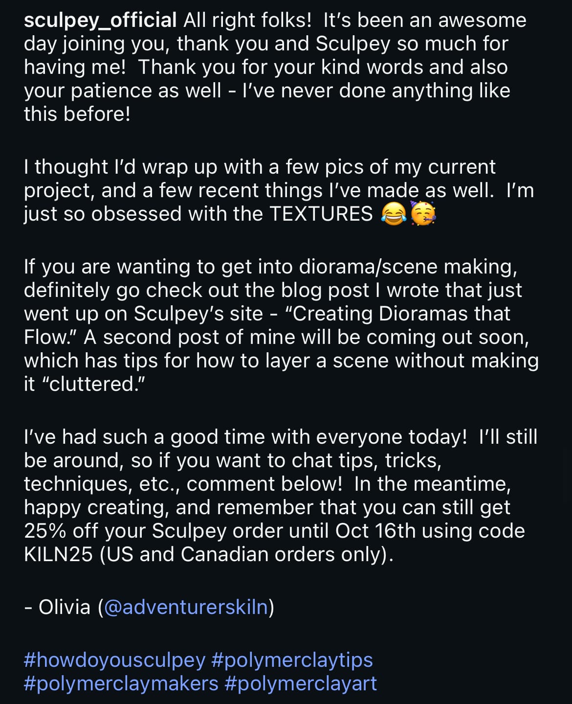 She shared details of their partnership in an Instagram post, including a tutorial with the brand's products, two blog posts she wrote for Sculpey's site, and a custom discount code her followers can use when they purchase with the brand.