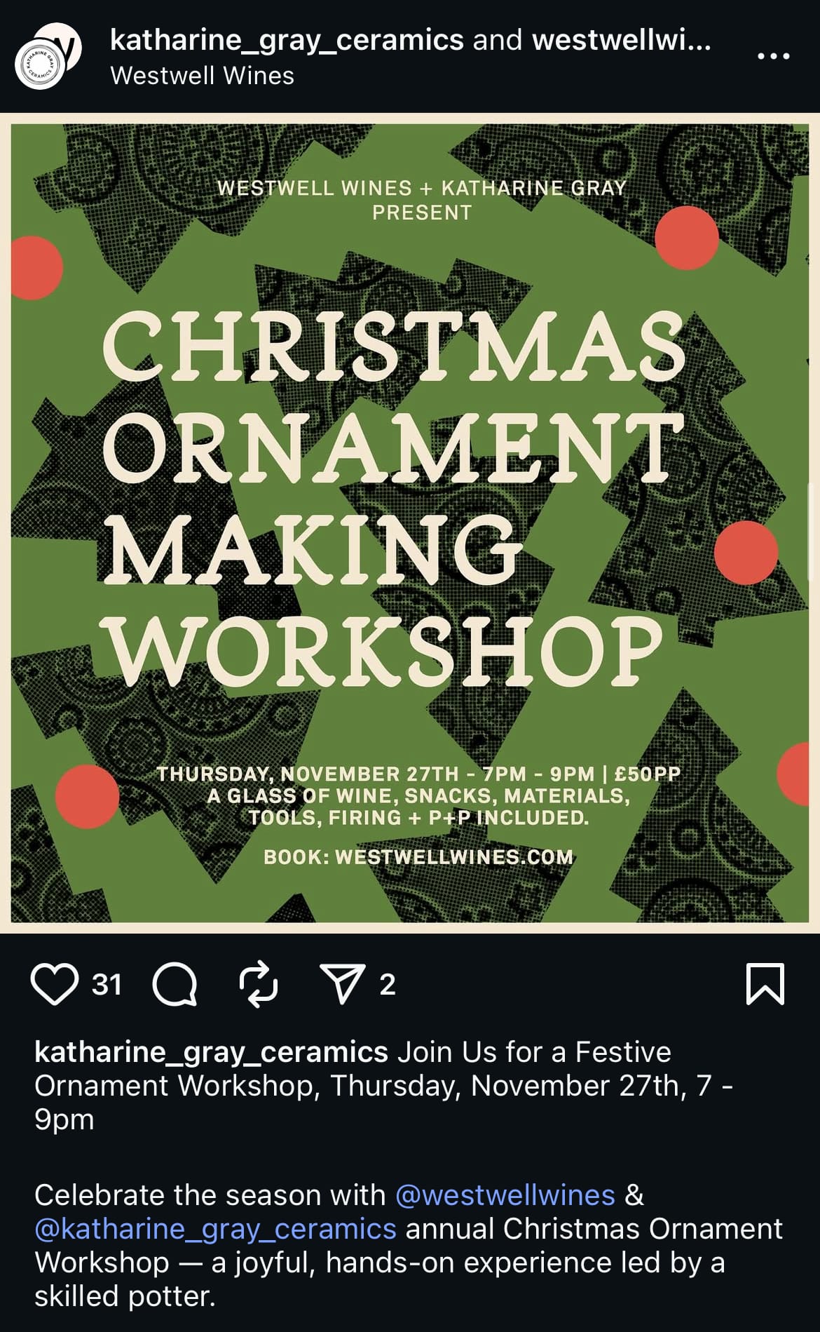 The post below announced that Katharine Gray Ceramics will have a Christmas ornament workshop this November at Westwell Vines Vineyard and Vinery, the company with which she collaborates on this.
