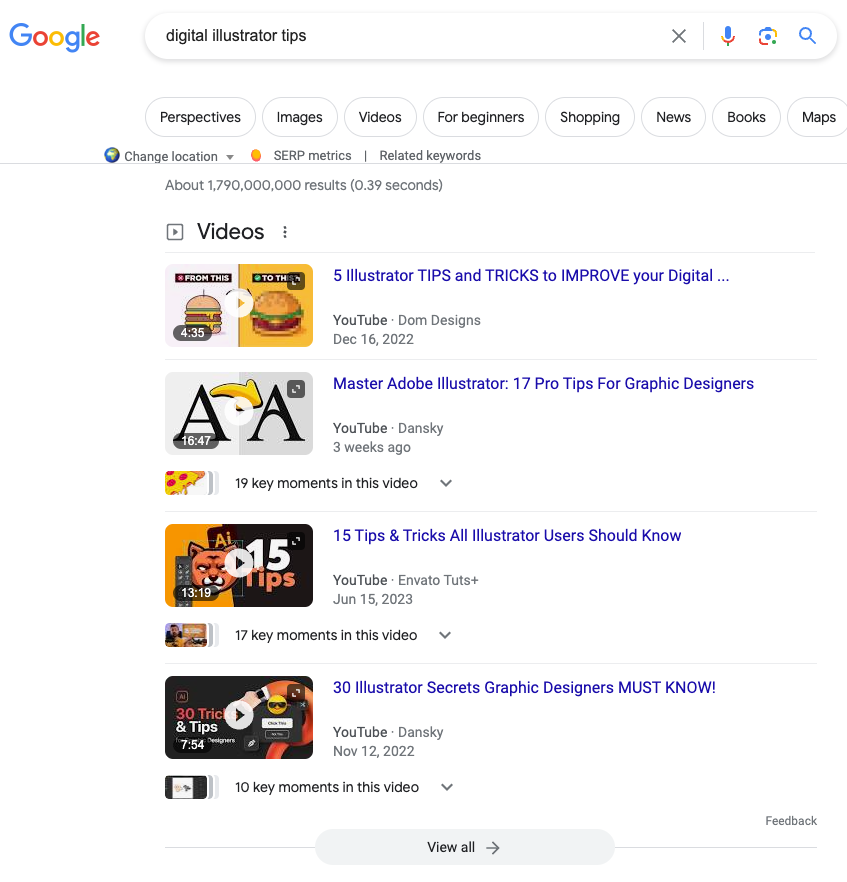 If you see many videos listed for a keyword or text-based content that also includes videos, it’s a sign that it’s better to create your content in a video format as well, because this is what Google thinks is the right format to use when answering the related search query (because users reacted better to that format).