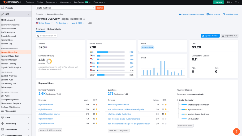 With a keyword research tool, you can find secondary keywords that you can use along with your main keyword in your content. Secondary keywords cover the same topic but with slightly different phrases or pointing to subtopics that you can use to your advantage. For example, if you want to write an intro-type of content about digital illustration and your main keyword is “digital illustration”, another variation of the phrase can be “digital art illustration”, and another related keyword is “what is digital illustration” in a question format. The tool showing you the keyword “what is digital illustration” also tells you that people are interested in knowing that, so you should dedicate a section to it in your content, answering that question by describing the term. |