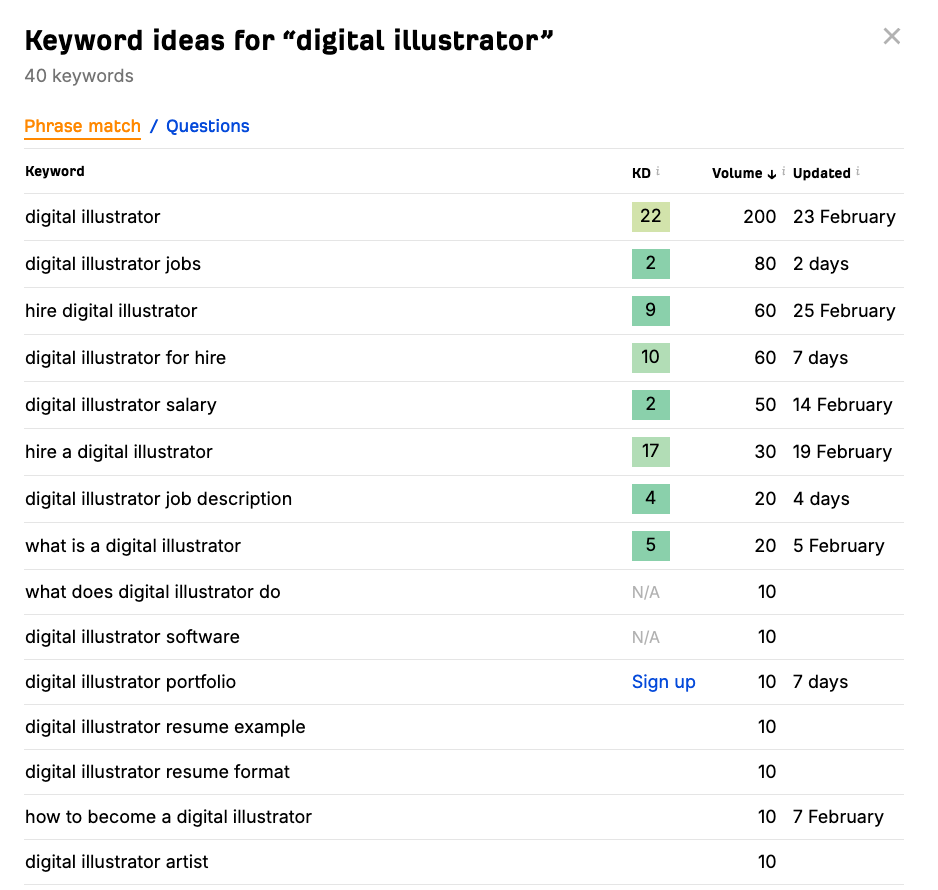 Ahrefs is the other big player in the market of SEO software tools. They have a well-known and well-respected keyword research tool that you can pay for, but for their free keyword generator, you don’t even have to create an account—you just open the page in your browser and get, for instance, 40 keyword suggestions (at the time of writing this) for the term and topic, “digital illustrator”.