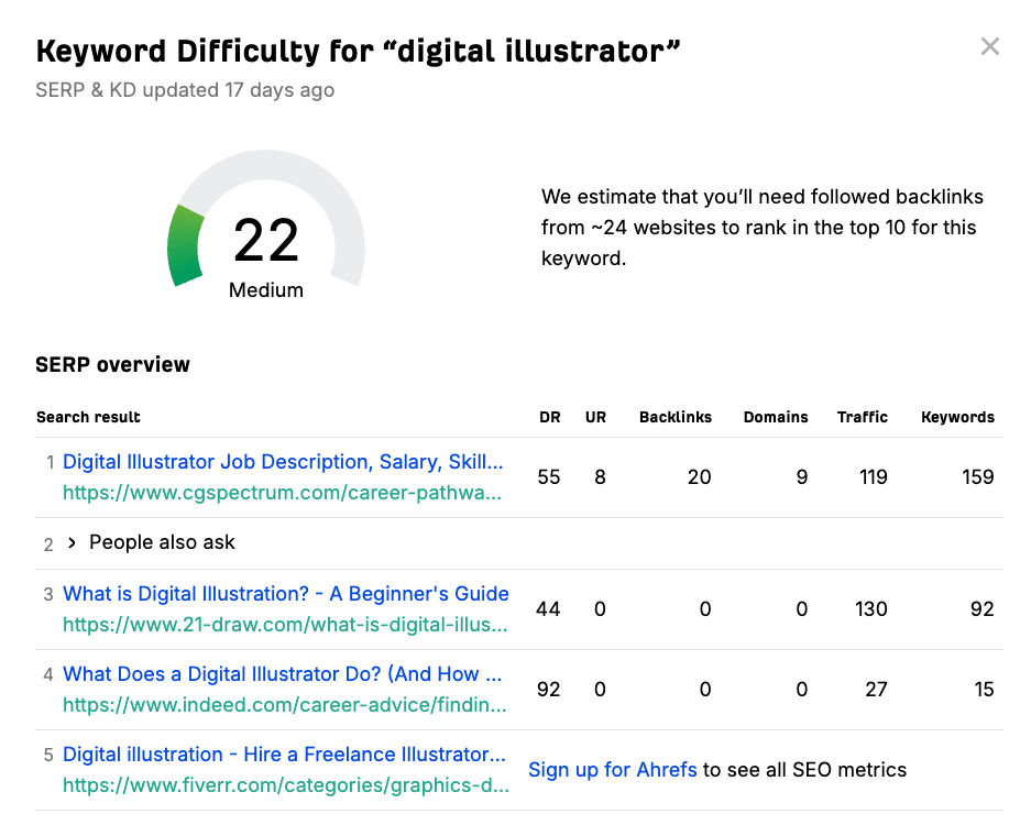 Another tool from Ahrefs, but this one focuses on keyword difficulty. As you can see from the screenshot, “digital illustrator” is a medium-difficulty keyword, and Ahrefs estimates that I’ll need to have backlinks from around 24 websites to rank in the top 10 in Google for this keyword.